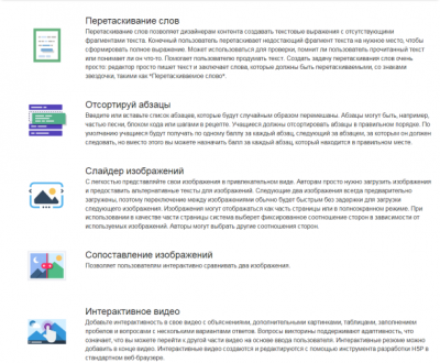 5. Сервис УДОБА – конструктор и хостинг открытых образовательных ресурсов https://udoba.org/. Включает такие задания, как: «Перетаскивание слов» (позволяет создавать текстовые выражения с отсутствующими фрагментами текста), «Отсортируй абзацы» (нужно отсортировать абзацы, перемешанные случайным образом), «Заполнение пропусков» (заполнить пропущенные слова в тексте) и т.д. Все задания логично соответствуют необходимым для формирования читательской грамотности умениям.