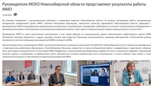 Именно по материалам официальных сайтов оценивалась активность включенности муниципалитетов в процесс совершенствования методической работы. Результаты этой оценки были озвучены в ходе совещаний С.В. Корольковой, заместителя министра образования Новосибирской области, с начальниками отделов (управлений) образования муниципалитетов региона, состоявшихся в мае 2023 года: https://nipkipro.ru/news/4637/.