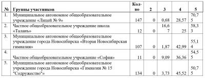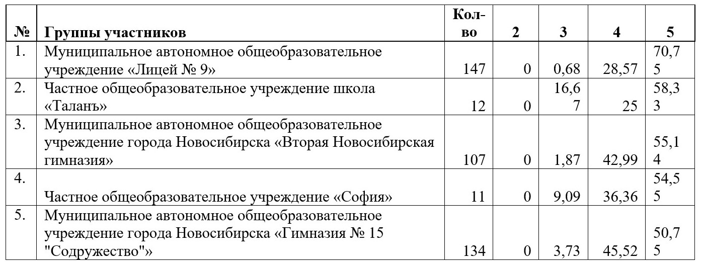 – 26 из 27 ОО с малым количеством участников, набравших высокие результаты (от 50 % отметок «5») расположены в муниципалитетах НСО, исключая г. Новосибирск.
