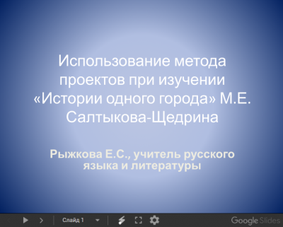 Первый этап: в рамках школьного курса по литературе изучение темы «История одного города» М. Е. Салтыкова-Щедрина с использованием мультимедийных технологий, создание презентаций. Дополнительно я задаю прочитать повесть современного автора Т. Толстой «Кысь».
