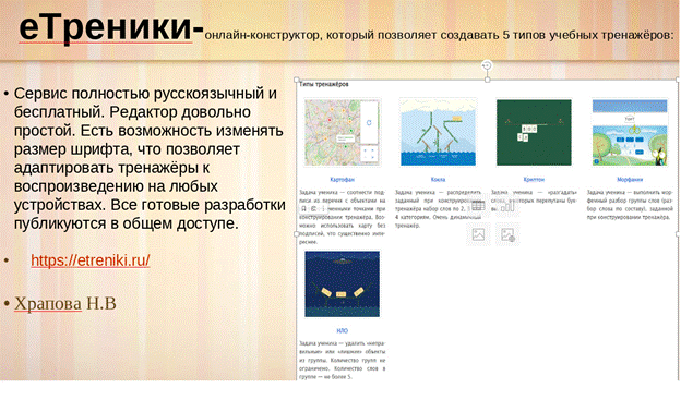 2. Использование тренажеров на уроках русского языка позволяет разнообразить формы работы, деятельность учащихся, активизировать внимание, повышает творческий потенциал личности, изменяется не только содержание учебного процесса, но и содержание деятельности ученика: ученик становится добытчиком новых знаний, тем самым повышая свою творческую активность, помогают ребёнку учиться, тренируя память, мышление, развивая речь и орфографическую зоркость, и дают возможность проверить свои знания. Один из сетевых конструкторов педагогических игр – еТреники – конструктор учебных тренажеров, вошедший в ТОП-30 лучших проектов Конкурса инноваций в образовании.