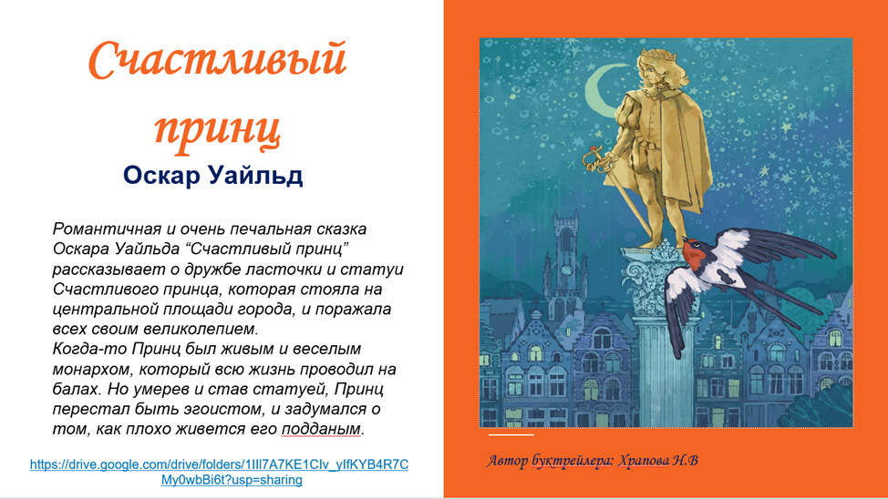 3. Наверняка, многим знакомы трейлеры к фильмам, буктрейлер – то же самое, только к литературному произведению. Цель буктрейлера – рассказать о книге, заинтересовать, заинтриговать читателя и убедить его прочитать это произведение. Буктрейлер может отражать атмосферу и жанр книги, рассказывать о ее сюжете или героях, содержать цитаты и комментарии автора. На первом этапе учитель создает общую презентацию на ЯндексДиске. Выбирает макет, на первом слайде делает титульный лист с названием проекта, на втором слайде свой пример книги с активной ссылкой на общую, совместную презентацию, куда дети добавляют свои работы по заданному алгоритму. Начать нужно с создания сценария к буктрейлеру (продумать сюжет и написать текст). К написанию текста сценария нужно подходить очень продумано. Важно не изложить произведение, а именно заинтриговать. Подобрать картинки, отсканировать иллюстрации книги, снять свое видео или найти видео в интернете; в своей презентации открыть доступ для всех участников, у кого есть ссылка. Пример оформления слайда: