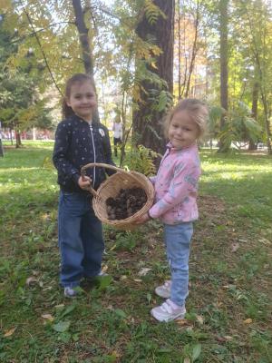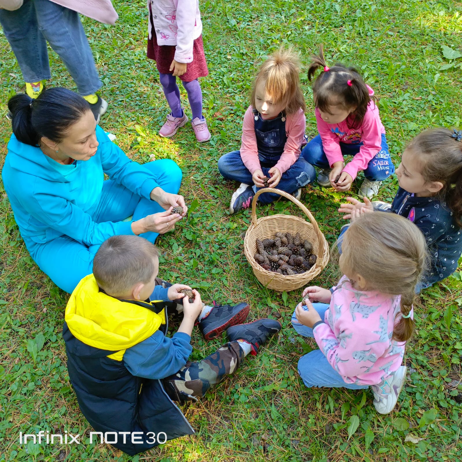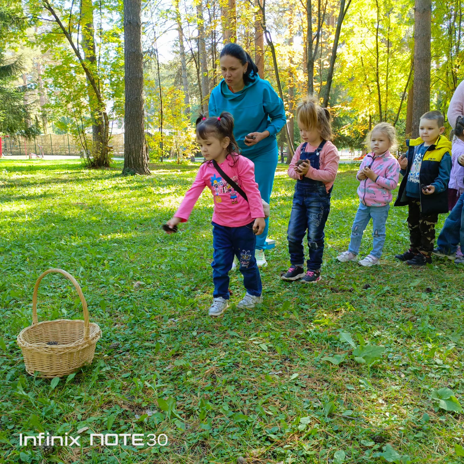 Воспитатель: А теперь, ребята, давайте соберем много шишек для белочки в корзинку.