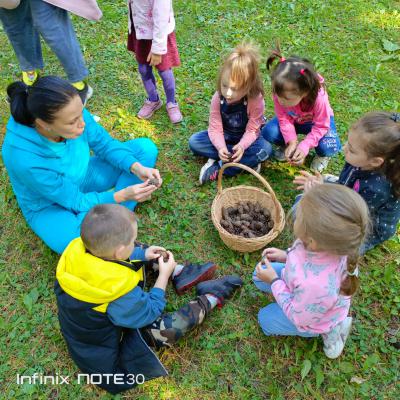 Воспитатель: Ребята, посмотрите, сколько на земле шишек! Давайте их рассмотрим. Посмотрите, какие они разные! Давайте обведем вокруг нее пальчиком, вот как пальчик ее обводит (помогает обвести). Какой формы у тебя, Артем, шишка? (овальной). Дети, какая у Артема шишка? (ответы детей). Женя, покажи свою шишку, обведи ее пальчиком, покажи детям. Вот какой кружок пальчик сделал. Какая у Жени шишка, какой формы? (индивидуальные и хоровые ответы детей). Ева, покажи нам свою шишку. Ой, какая она у тебя интересная, раскрыла свои чешуйки. Потрогайте шишки, какие они? Твердые или мягкие? Зажмите шишку в кулачке. Что вы чувствуете? (шишки колются).