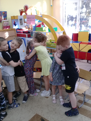 Пожали друг другу руки, поздоровались ладошками (внутренней и тыльной стороной), локтями, плечами, спинами, коленями, бедрами, носками, пятками, ушами, носами, затылками, обнимаем друг друга.