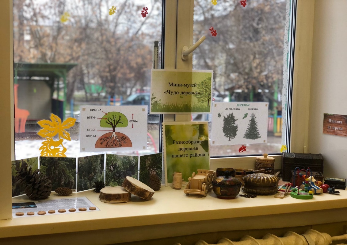 Совместными усилиями родителей, детей и педагогов нам удалось организовать мини-музей «Чудо-деревья», который включает в себя наглядный материал по разнообразию и строению деревьев, коллекцию шишек от разных хвойных деревьев, различные спилы деревьев, кору, гербарий, а также всевозможные экспонаты из дерева – посуда, шкатулки, украшения, игрушки и т. д.