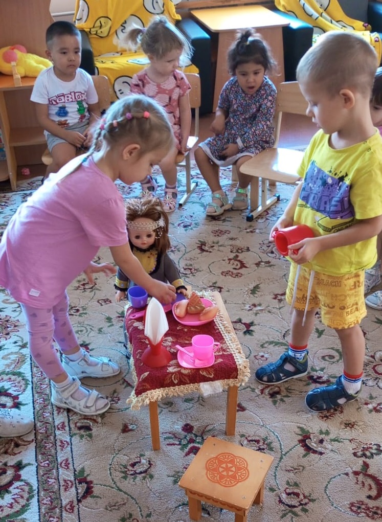 В первую очередь мы познакомили детей с куклой в национальном чулымском костюме, подготовили и провели сюжетно-ролевую игру «Напои куклу чаем». По русским традициям мы вместе с детьми сервировали стол, готовили посуду для использования в быту и сладости из соленого теста и бросового материала. Дети угощали куклу чаем со сладостями.