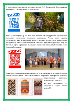 Письмо для наших друзей состояло из 2-3 страниц, в нем содержалась информация о достопримечательностях или каких-либо значимых объектах нашего города, их фотографиях и сведениях о нашей группе. Через QR-код мы знакомили детей из других городов с коми языком и поэзией на коми языке, со звучанием наших национальных музыкальных инструментов.