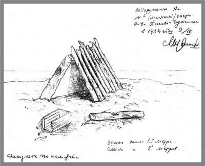 Оригинал рисунка топографа М. И. Цыганюка объекта 1934 года на острове Попова-Чухчина.