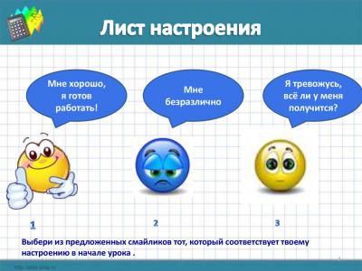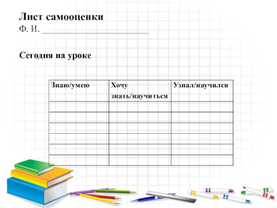 Оборудование: презентация Power Point, рабочий лист, листы самооценки и настроения.