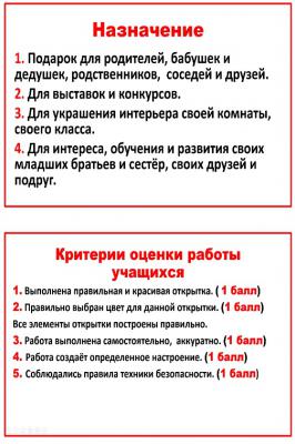 2. Дети узнали назначение выполненной ими работы. Её применение. (Открытка может быть украшением интерьера, может быть подарок. Открытку можно использовать для выставки, для конкурса.