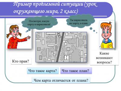 Главная ценность проблемных ситуаций состоит в том, что дети в очередной раз получают возможность сравнивать, наблюдать, делать выводы; убеждаются в том, что не на каждый вопрос есть готовый ответ, что ответ может быть неоднозначным, что каждый из них имеет полное право искать и находить свой ответ, отстаивать свое мнение. Дети могут погрузиться в мир математики через мультфильмы, совместно решая поставленные проблемы или выполняя исправления, заранее приготовленных педагогом неправильных записей. Мир русского языка преподносит детям проблемы решения противоречий написания и произношения. Ребята «погружаются» в проблему и проводят эксперимент на окружающем мире. Создается проблемная ситуация, когда учащиеся не знают способа решения поставленной задачи, не могут ответить на проблемный вопрос из-за недостатка или отсутствия знаний.