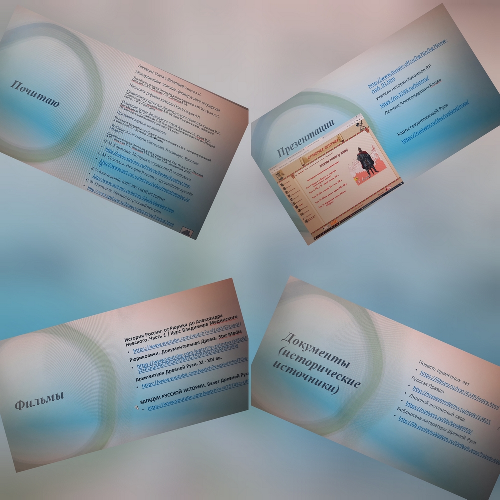 В своей работе использую приём «Методический пузырь». Предлагаю рассмотреть его на примере исторического этапа «Русь Древняя». В ходе изучения материала по данной теме собирается методическая копилка, в которую постепенно вносятся изучаемые исторические источники, монографии, фильмы, презентации и т.д. Мы с ребятами определили следующие элементы – это Документы, Фильмы, Презентации, Карты, Монографии историков. Данный приём позволяет систематизировать материал, расширять знания по периоду, дополнять полезными ссылками, книгами и т.д. каждый элемент «пузыря». Такая систематизация позволяет не только подготовиться к олимпиадным заданиям, но и пользуется популярностью при подготовке к единому государственному экзамену.