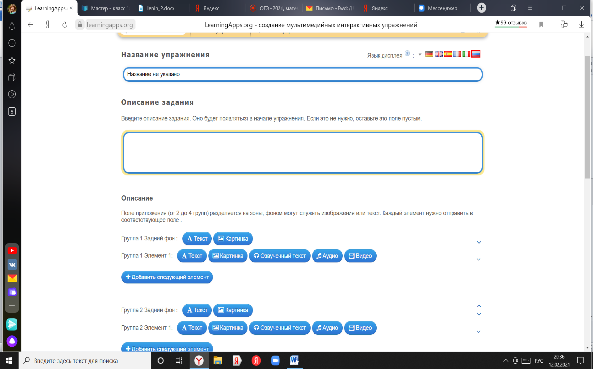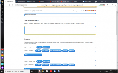 Рисунок 6. Заполнение вкладок при создании нового упражнения с помощью сервиса Learningapps.org