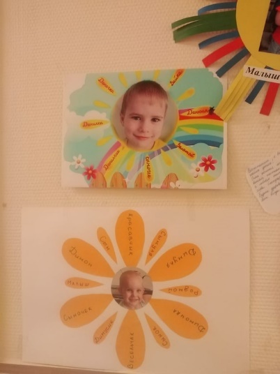 Акция «Мой портрет в лучах солнца»: принимают участие родители и дети средних, старших и подготовительных групп. Родителям предлагается красочно оформить солнышко: в середине фото ребенка, на лучиках написать семейные ласковые производные имени ребенка.