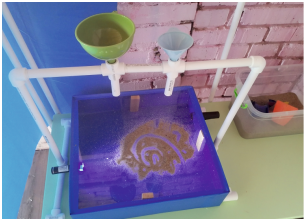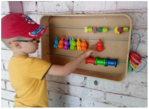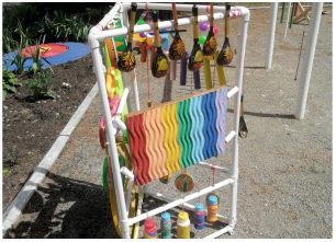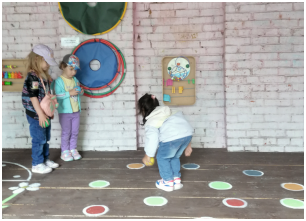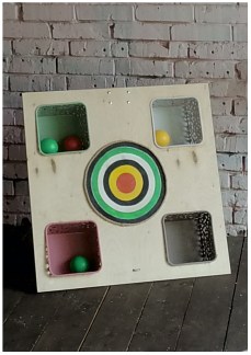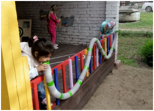 Мы и родители наших ребят – младшей группы № 1, объединив усилия, изготовили разнообразное нужное и полезное оборудование для игр детей. Создавали оборудование для игр, сделав акцент на исследовательской деятельности. Задачи – развитие пространственных представлений, речи детей младшего дошкольного возраста через игру, экспериментирование с водой, песком, светом. Нами были созданы «Мини-лаборатория» для экспериментирования с водой, песком и шариками, «Световая песочница», оборудование для метания мячей, «Весы большие и малые», «Игры с обручами», «Телефон», оборудование для развития общей моторики и координации движений «Игра – кольцеброс «Слонята». На полу веранды были изображены орнаменты для подвижных игр с использованием разноцветных шаров и кеглей. С помощью данного оборудования можно решать множество задач: развивать ориентировку в пространстве, формировать умение попадать в цель правой и левой рукой на разном расстоянии, а также эталоны цвета. Игра безопасна и проста в изготовлении.