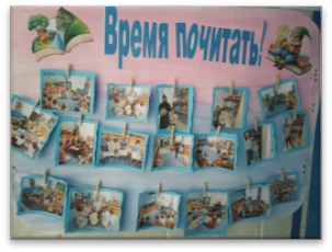 Каждый месяц в книжном уголке мы оформляем тематические выставки, посвященные творчеству детских писателей и поэтов. А также в приемной группы был организован информационный стенд «Читайте вместе с нами», который был создан для привлечения внимания детей и родителей к миру детских книг, стенд содержит рубрики: «Эти книжки для вас, ребятишки», в ней представлены произведения, описывающие природу, объекты природы; «Юбилей писателя, праздник для читателя!», в этой рубрике предложено творчество писателей-юбиляров; «Прочитай и улыбнись!», в этом разделе размещаются юмористические стихи. Кроме того, на стендах располагается информация для родителей (рекомендации, памятки, буклеты) по развитию и поддержке интереса детей к чтению, развитию нравственности и духовности в условиях семейного воспитания и досуга.