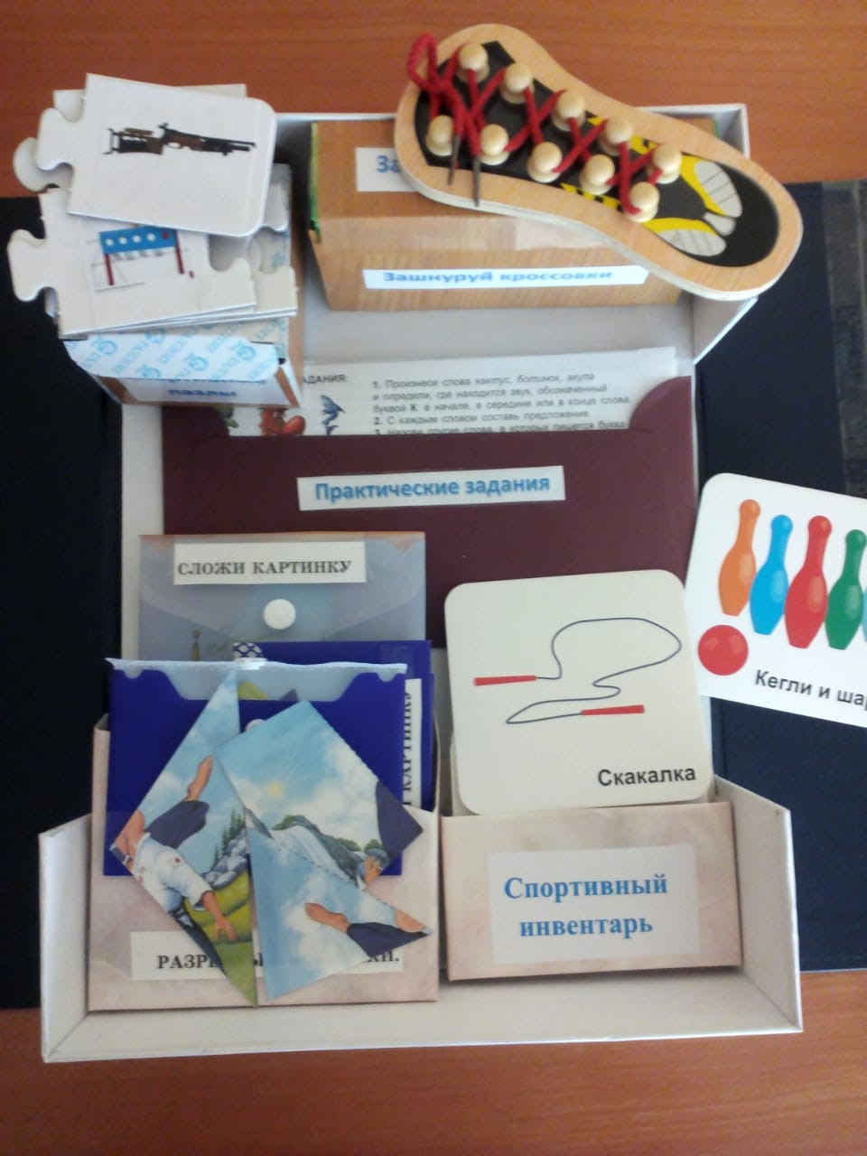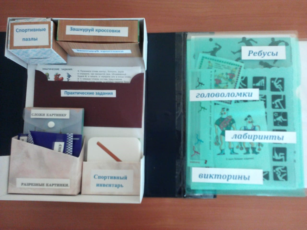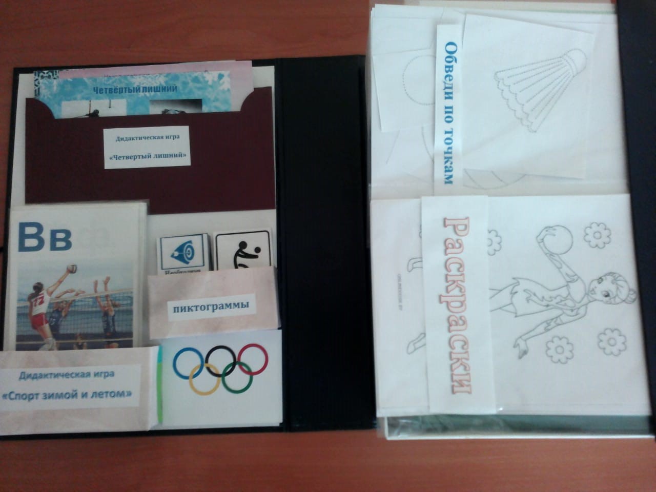 Лэпбук «Спорт всегда со мной» содержит различные материалы по теме спорта: фотографии, иллюстрации, тексты, загадки, стихи, раскраски, игры, аппликации и т. д.