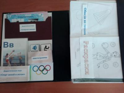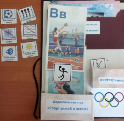 Описание игры: карты с изображением разных видов спорта, маленькие карточки (пиктограммы). Ребенок подбирает к своей карте несколько пиктограмм, подходящих под описание, и рассказывает об этом виде спорта.