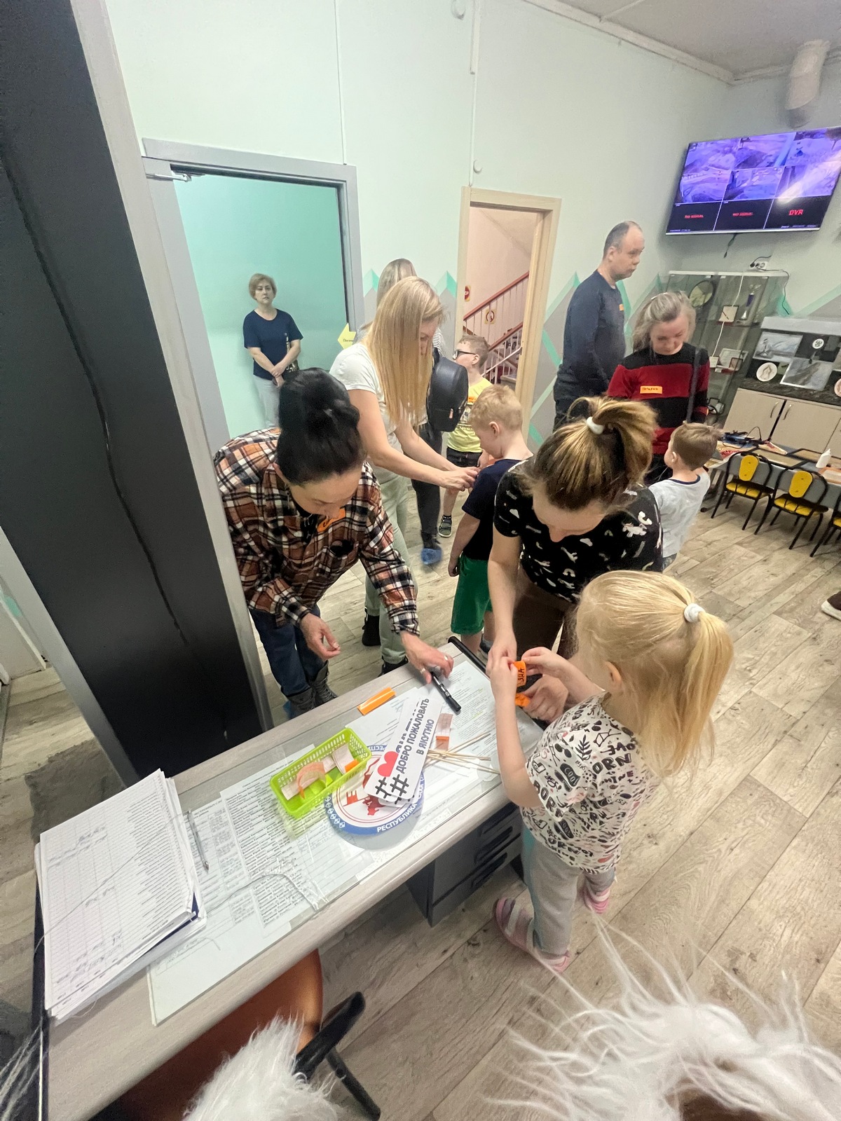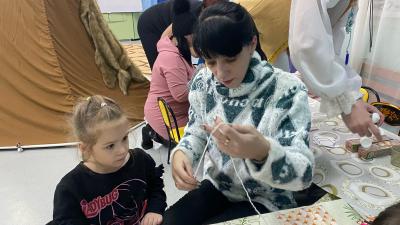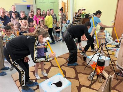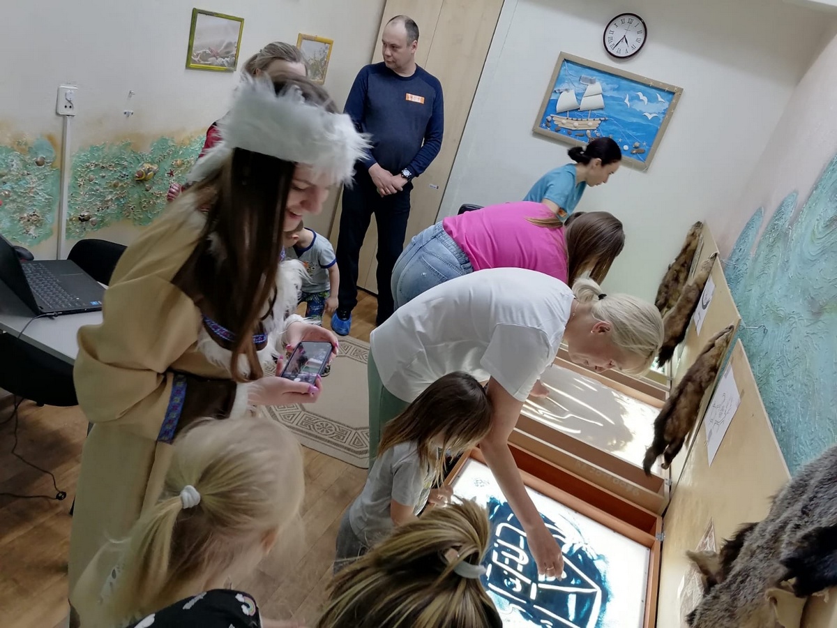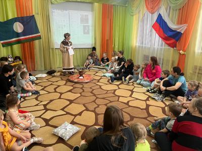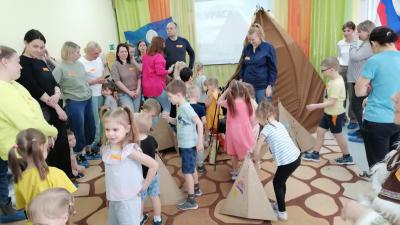 Например, в нашем детском саду проводилось «Интерактивное путешествие в Якутию». Родители знакомились с технологией интерактивных путешествий по Сибири, которую мы используем в рамках реализации вариативной программы для детей старшего дошкольного возраста. Родители получили возможность погрузиться в детство и вместе с детьми отправиться в путешествие. Мы применяли различные форматы организации. Встреча гостей прошла в формате «Создай себе бейджик», каждому участнику давался кусочек самоклеящейся бумаги, на котором они делали надпись, как к ним должны обращаться другие. Пока шёл сбор гостей, родители с детьми могли фотографироваться в фотозоне, с якутскими атрибутами и хэштегами. Далее знакомство участников прошло в формате «Общий круг», где все расположились на ковре на мягких подушках, шкурах и т. д. Мы поиграли в игру на сближение, представили родителям план программы и рассказали о технологии интерактивных путешествий по Сибири. Для погружения родителей в тему мы посмотрели совместно мультфильм про Якутию. Затем отправились туда на резиновой лодке – элемент тимбилдинга (всем родителям нужно было поместиться в одну небольшую лодку, а дети были волнами и чайками). Для эффективного погружения родителей в технологию мы применили практико-ориентированный формат, участники были разделены для постройки якутского древнего жилища Урасу: дети отправились мастерить из бросового материала, а родители собирали настоящую большую Урасу, «разводили костер», готовили котелки и чан. После того как жилища были построены, мы объединили их в целую якутскую деревню. Дальше дети совместно с родителями должны были добыть рыбу (сделать прорубь, выловить рыбу, сложить в котелки). Затем деятельность была организована в формате локаций. Участники разделились на 4 группы, чтобы смастерить себе сувениры на память.