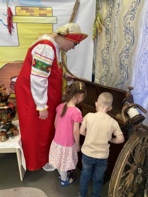 2. Продуктивный этап. Для решения поставленных задач на данном этапе мы использовали экскурсии в музей «Русская изба», созданный в нашем ДОУ, которые вызвали у детей живой отклик, позволили погрузить их в атмосферу старины и воочию увидеть русское жилище. Дети знакомились с предметами старины, могли их рассмотреть и изучить тактильно.