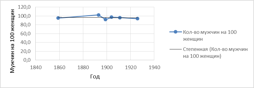 График наглядно показывает, что количество мужчин в населении на протяжении изучаемого периода было, как правило, меньше числа женщин: по данным 1859, 1893, 1904, 1911 и 1926 годов, на 100 женщин приходится в среднем 96,3 мужчины. Единственный год, когда зафиксировано количественное преобладание мужского населения – 1893-й. При этом представленная на графике линия тренда свидетельствует о господстве тенденции к сокращению доли мужского населения во Вьюнах. Эту тенденцию можно связать с происходившими в начале ХХ в. большими мужскими потерями в ходе войн – Русско-японской, Первой мировой и Гражданской.