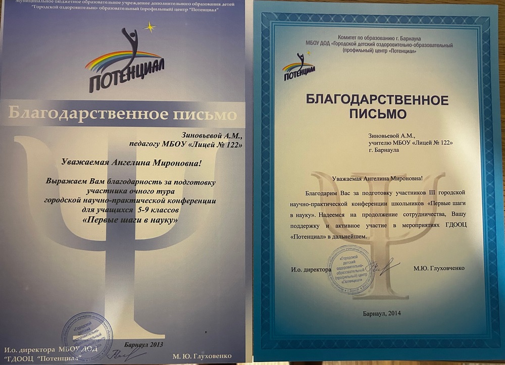 Более 10 лет мои обучающиеся принимают активное участие в научно-практических конференциях разных уровней: ежегодно начинается все со школьного этапа, затем переходит на этап района, города и региона. Одним из первых важных и значимых мероприятий в своей педагогической деятельности по праву могу считать НПК «Первые шаги в науку» как приоритетное для комитета по образованию города Барнаула направление работы с одаренными детьми, проводимое на базе МБОУ ДОД «Городской детский оздоровительно-образовательный (профильный) центр «Потенциал». Целью является создание условий для развития у подростков (5-9 классы) креативности, самостоятельности мышления, навыков владения предметом исследования, расширение кругозора. Задачи выделяются следующие: выявление и поддержка одаренных и высоко мотивированных детей, стимулирование их к творчеству и экспериментальной работе; пропаганда лучших достижений обучающихся; совершенствование психологического и педагогического сопровождения одаренных и способных детей; формирование системы сетевого взаимодействия образовательных учреждений города по реализации цели конференции. НПК проводится по секциям (физика, астрономия, химия; техническое творчество, математика, биология, география; экология, медицина; лингвистика (русский язык), литературоведение; педагогика, психология; история, этнография; искусствоведение, культурология).