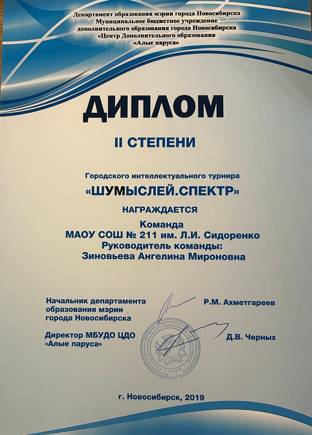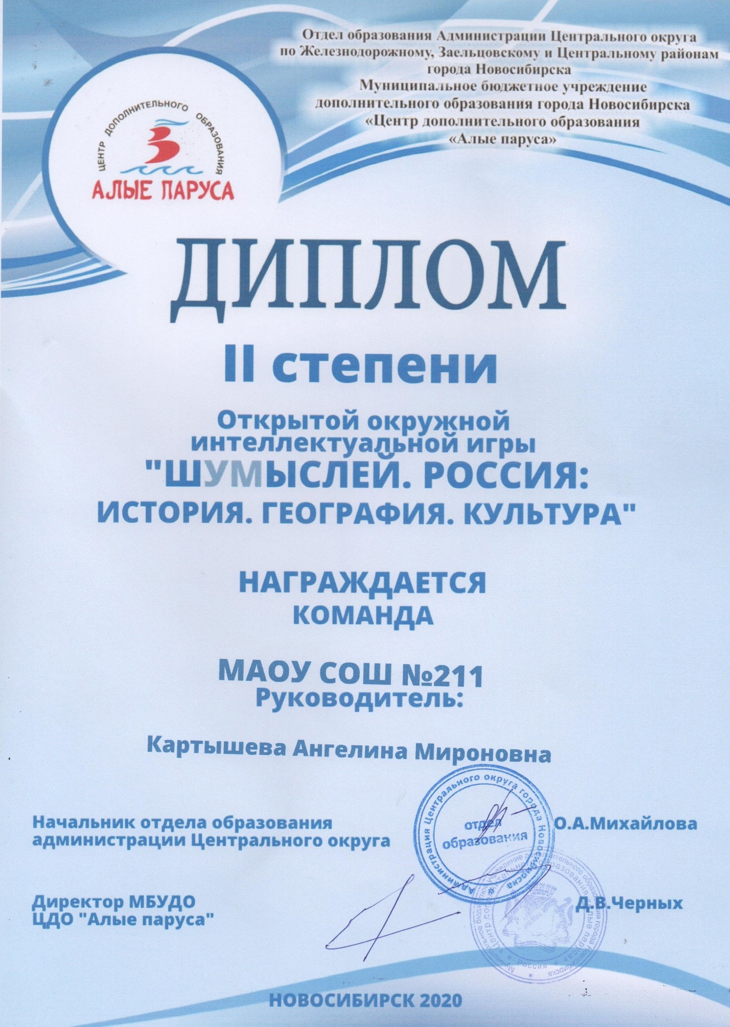 Большой находкой для себя считаю Открытый окружной интеллектуальный турнир «ШУМЫСЛЕЙ», проводимый МБУДО ЦДО «Алые паруса» при поддержке администрации Центрального административного округа по Железнодорожному, Заельцовскому и Центральному районам города Новосибирска. Целью Турнира является создание условий для развития и реализации интеллектуально-творческого потенциала подростков 14-17 лет посредством творческой и интеллектуально-игровой практики. Задачи: формирование навыков поиска, обработки, систематизации информации по заданной тематике; формирование у учащихся навыков игрового взаимодействия, создание ситуации значимости каждого ребёнка при работе в команде; воспитание гармонично развитой и социально ответственной личности на основе духовно-нравственных ценностей, исторических и национально-культурных традиций. Командам, состоящим из 5 человек (14-17 лет), предполагалось посещение 2-х игр в течение учебного года очно, третья игра проходила в онлайн-формате на платформе ZOOM, в течение игры участникам команды было необходимо переходить по кликабельным ссылкам и просматривать некоторый материал для ответа на тот или иной вопрос игры, обсуждать в отдельной «комнате». Нужно отметить, что темы турнира носили межпредметный характер (ИСТОРИЯ. КУЛЬТУРА. ГЕОГРАФИЯ, ПОЭТЫ СЕРЕБРЯНОГО ВЕКА, ПРИКОСНОВЕНИЕ КУЛЬТУР). Предварительно давались источники для подготовки по темам игры, участники умело распределяли этот объем между собой, делились прочитанным на переменах и в свободное от уроков время, сплоченная команда – залог успеха.