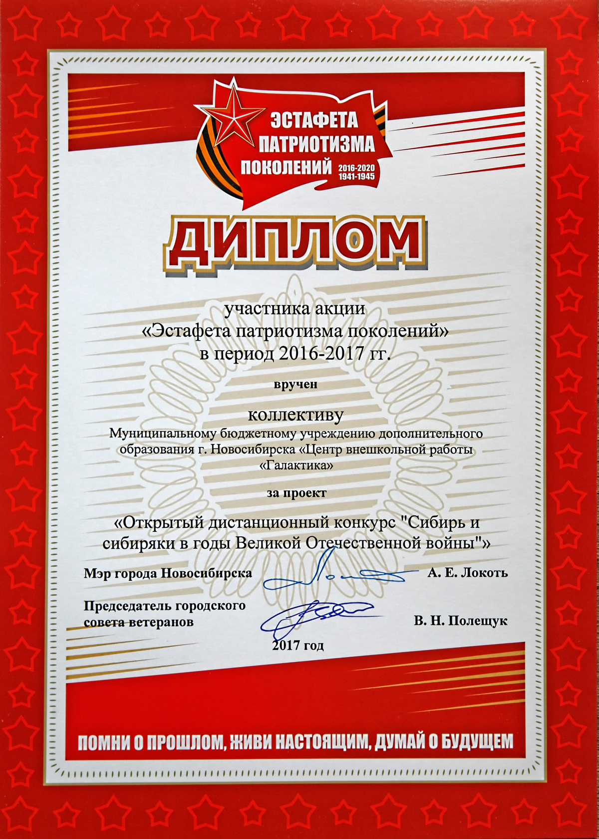В проектах «Родное слово», «Сибирь и сибиряки в годы Великой Отечественной войны. Героические страницы нашего Отечества» (этот проект в 2017 году был награждён дипломом городской акции «Эстафета патриотизма») принимают участие все участники, кому дорог родной язык, дорога память о героических страницах нашего Отечества.