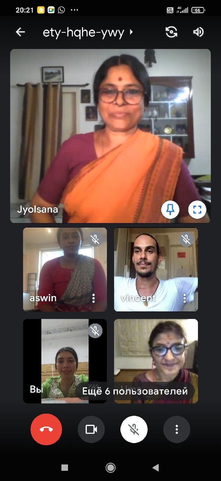 – мастер-классы в заочном формате через ВК и Googlе Meet с педагогом и профессором Академии «Калакшетра» Джолсаной Менон, которая создала международную группу студентов из России, Индии, Японии, Италии и др., для систематического изучения танцевального стиля Юга Индии – Бхарата Натьям. Профессор в течение года делает рассылку теоретического материала и затем, в онлайн режиме, объясняет практический материал на платформе Googlе Meet. Учащиеся студии «Васанта» осуществляют перевод теоретического материала с английского языка и практикуются в разговорной речи. Профессор Джолсана Менон изучает русский язык;