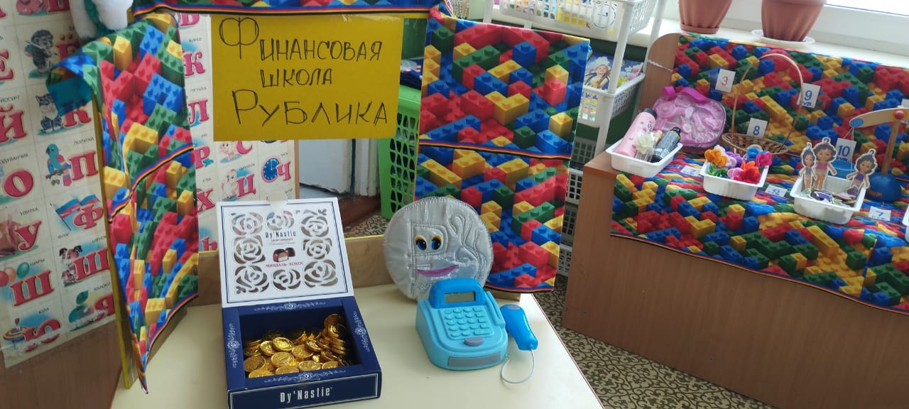 В этом учебном году в нашем учреждении одной из задач годового плана стоит «Формирование экономической компетенции детей дошкольного возраста через освоение азов финансовой грамотности». В рамках этой задачи мы вместе с родителями нашей группы решили организовать свою финансовую школу. Подобрали соответствующий методический и демонстрационный материал по этой теме, создали предметно-развивающую среду. Своими руками изготовили макеты «Банк», «Касса», «Банкомат». В группе организовывали сюжетно-ролевые игры с экономическим содержанием. В нашей финансовой школе героем стал «Рублик» – умный, крепкий и немного хитрый персонаж. Теперь он приходит на каждое занятие по финансовой грамотности. С его помощью дети познакомились с историей денег; поняли, откуда у взрослых берутся деньги; как распределять свои деньги; что такое банки и для чего они нужны.
