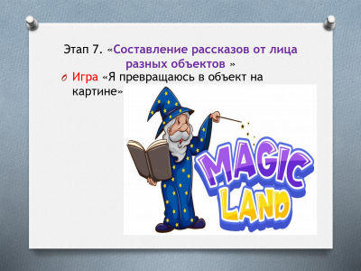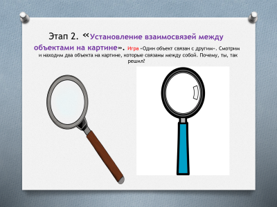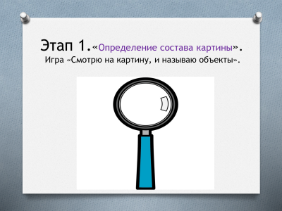 Освоение обобщенных способов составления рассказов по картине включает 9 этапов. Для работы с детьми я разработала презентацию по всем этим этапам. Она используется как алгоритм действий в работе над картиной. Я подобрала картинки (эмблема) для каждого этапа. Когда ребенок видит эмблему, то он уже знает, какие нужно совершить мыслительные действия.