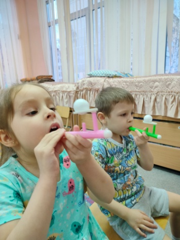 Важнейшие условия правильной речи – это плавный длительный выдох. Качество речи, её громкость, плавность во многом зависят от речевого дыхания. Для проведения дыхательных упражнений в кабинете имеется следующее оборудование: игра-тренажер для дыхания «Веселые зверята»; дыхательные игры «Загони мяч в ворота», «Остуди чай», «Лыжники», «Буря в стакане»; воздушные мобили «Подуй на снежинку (листочки, птичку, бабочку, вертушку)»; тренажеры «Накорми кошку», «Накорми пчелку», «Прожорливый апельсин», «Клубничка», «Тучка».