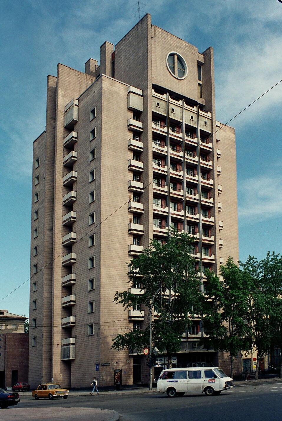 Напротив – гостиница «Октябрьская», прозванная «Свечкой». Она была построена в 1975-м как общежитие высшей партийной школы КПСС, которая готовила руководящие партийные и советские кадры. Комнаты на нижних этажах были получше – там жили преподаватели и гости, а наверху – рядовые слушатели. За загадочными круглыми окнами на крыше – небольшой спортивный зал и сауна.