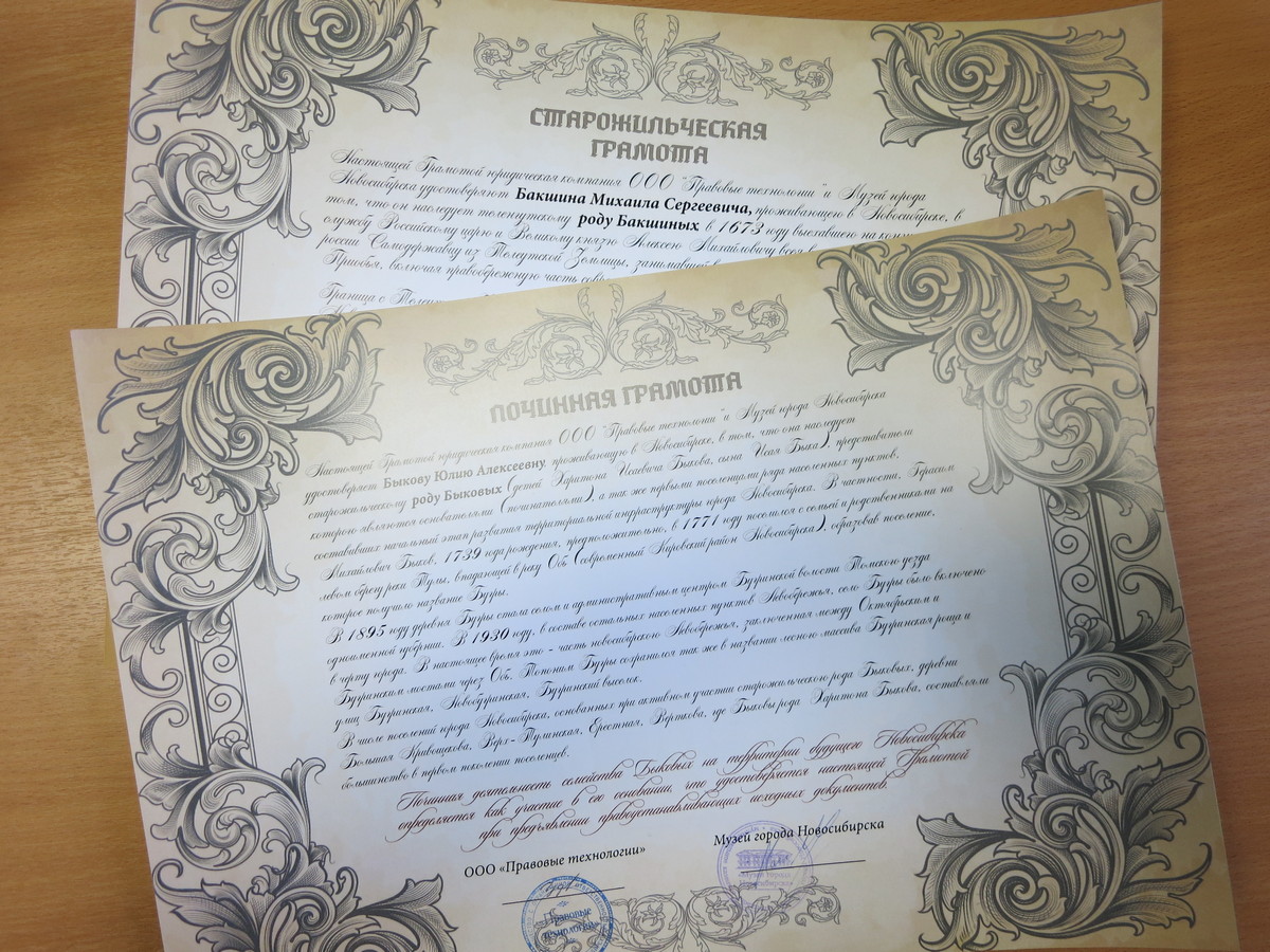 В 2016 году Новосибирское отделение Союза журналистов и Музей Новосибирска проводили мероприятие, на котором отмечали старожильческие фамилии нашего города. «Починные грамоты» тогда получили двое: Михаил Бакшин, ведущий свой род от выезжих телеутов, в XVII веке служивших царю Алексею Михайловичу Романову и Юлия Быкова, которая провела собственное генеалогическое исследование и утверждает, что является прямым потомком легендарных основателей Быковых.