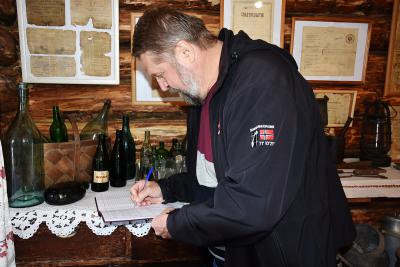 Автор оставляет запись в книге отзывов музея Бугров. 2024 г. Фото В. Ларичева