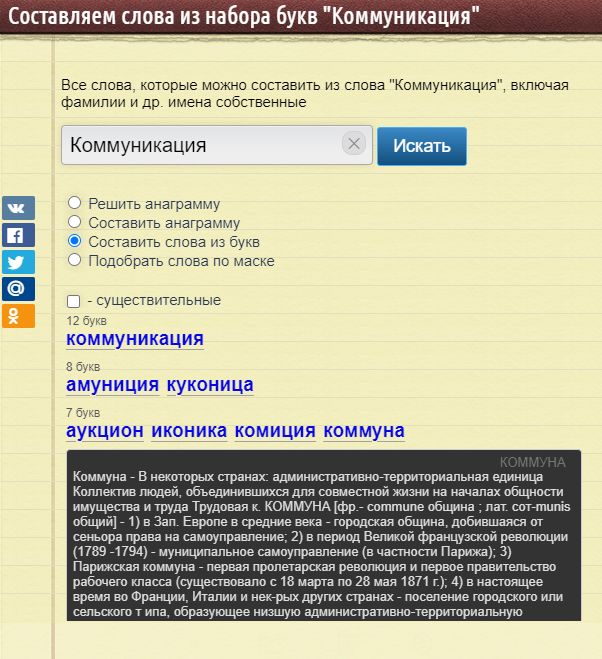 Сервис «Анаграмма»: https://anagram.poncy.ru/. В данном сервисе мы можем решить или составить анаграмму, составить слова из букв или подобрать слова по маске. Этот сервис мы можем использовать, например, для изучения новых слов, так как к каждому слову дается определение, иногда сопровождающееся иллюстрацией.