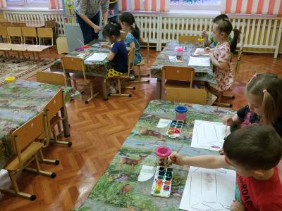Воспитатель: Молодцы! А теперь приступим к нашему заданию. (Дети выполняют задание воспитателя, при необходимости воспитатель помогает держать кисточку правильно.)
