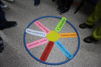 На линии старта перед каждой командой лежат гимнастические палки по количеству игроков. На расстоянии 10 метров от линии старта перед каждой командой кладут обруч. Задача участников эстафеты – поочередно говорим вежливое слово, берём палку и кладём их лучами вокруг своего обруча – «нарисовать солнышко». Молодцы! Вы много знаете вежливых слов.
