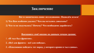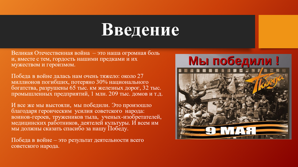 И все же мы выстояли, мы победили. Это произошло благодаря героическим усилиям всего советского народа: воинов-героев, тружеников тыла, ученых-изобретателей, медицинских работников, деятелей культуры. И всем им мы должны сказать спасибо за нашу Победу.