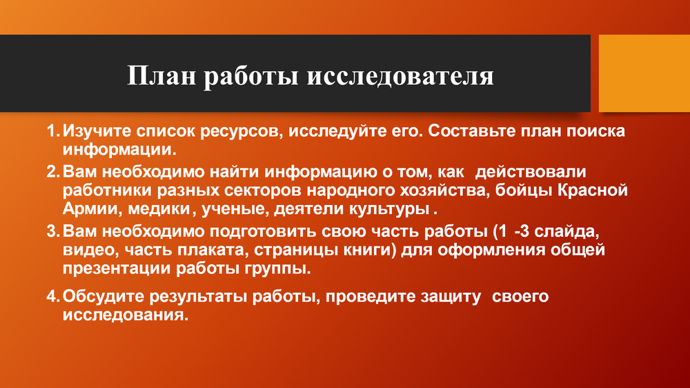 2. Вам необходимо найти информацию о том, как действовали работники разных секторов народного хозяйства, бойцы Красной Армии, медики, ученые, деятели культуры.