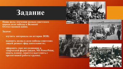 Наша цель: изучение вклада советского народа в дело победы в Великой Отечественной войне.