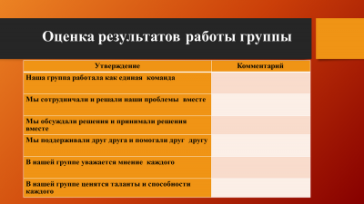 – оценка (может включать как шкалу для самооценки и оценки работы коллег по группе, так и описание критериев оценки преподавателем);