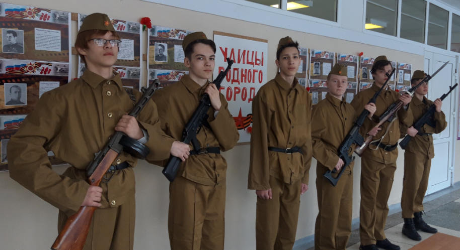 Ежегодно 9 мая наш народ отмечает знаменательную дату – день Победы. В нашей школе стали традиционными мероприятия, посвященные этому празднику. На протяжении нескольких последних лет смотр строя и песни в нашей школе проходит в начале мая и посвящен он Дню Победы. В нем принимают участие учащиеся 5–11 классов. Руководимый мной 7 Г класс постоянно принимает в нем участие и занимает призовые места. Участие в смотре строя и песни формирует у учащихся навыки строевого шага, сплоченность коллектива, чувство воинского долга. После школьного этапа смотра строя и песни мы формируем команду для участия в районном строевом смотре, на котором команда нашей школы показывает хорошие результаты.