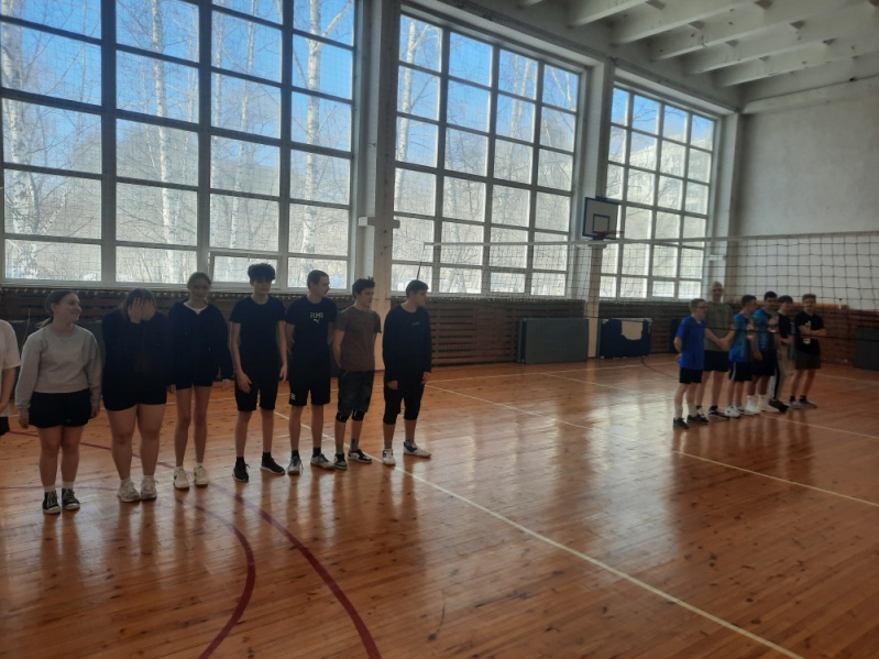 Команды 8 и 10 классов перед началом соревнований по волейболу, 6 мая 2023 г.