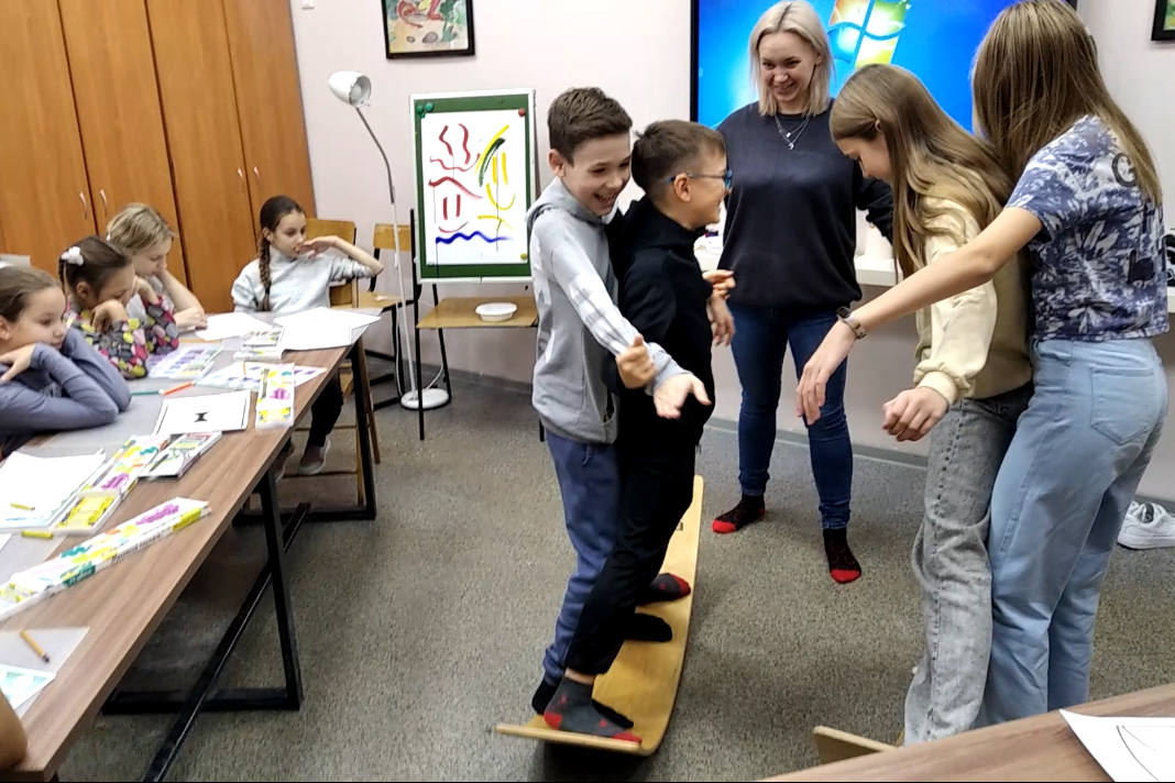 Данный метод очень успешно работает именно при занятии изобразительной деятельностью. Например, при создании рисунка на тему «Снежный барс» мы с детьми просматриваем видео про особенности этого животного, о среде его обитания (визуальный канал). Слушаем его голос в разных ситуациях (слуховой канал), дети изображают повадки барса, его походку, движения (вестибулярный, проприоцептивный). А чтобы еще больше погрузиться в среду обитания животного, я предлагаю детям потрогать камни различной текстуры, мох, понюхать его (тактильный, обанятельный канал). И после этого дети самостоятельно погружаются в творческий процесс создания изображения снежного барса. В процессе работы они могут самостоятельно обратиться к тому или иному стимулу. Эта работа помогает детям сконцентироваться, но при этом дает возможность переключать внимание на различные стимулы, а также активизирует воображение. Для можечковой стимуляции я использую различные нейротренажеры. Детям очень нравятся нейроборды. Это вогнутые доски, на которых дети, раскачиваясь, выполняют различные упражнения с мячом и без. Выполнение этих упражнений вызывает у детей бурную эмоциональную реакцию, что, помимо стимуляции головного мозга, помогает сбросить накопившееся напряжение.