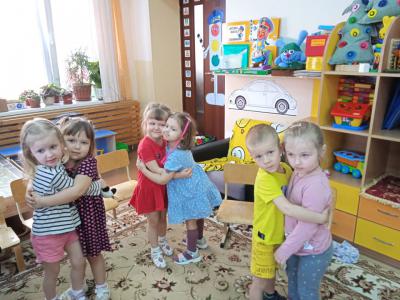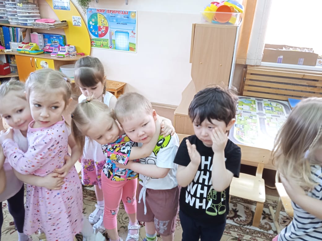 Во время «утреннего круга» мы провели с детьми игру «Давайте поздороваемся», где учили детей здороваться друг с другом и игру «Я хочу с тобой дружить». После просмотра мультфильма «Трям, здравствуй!» мы провели беседу на тему «О дружбе».