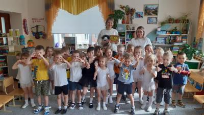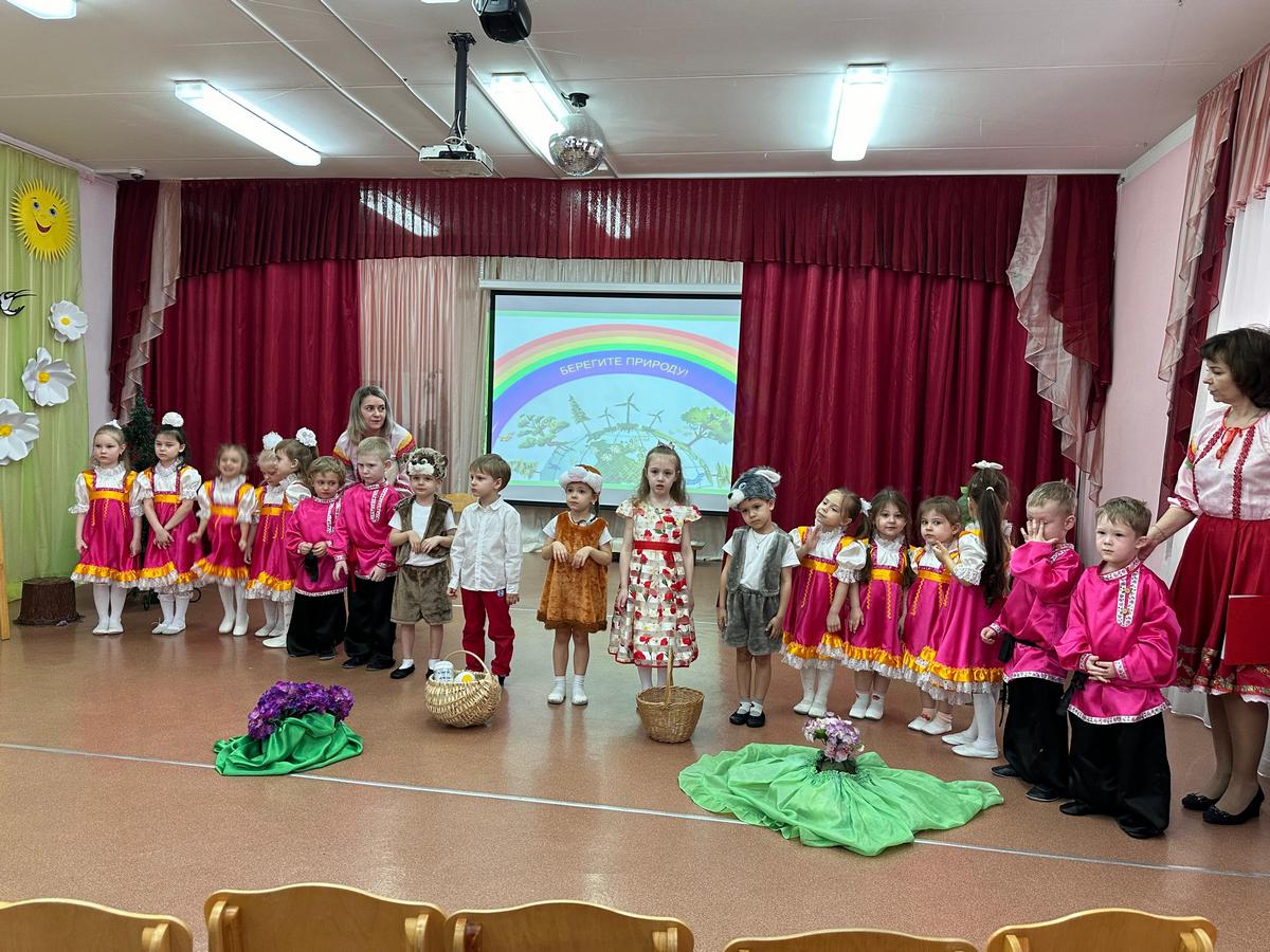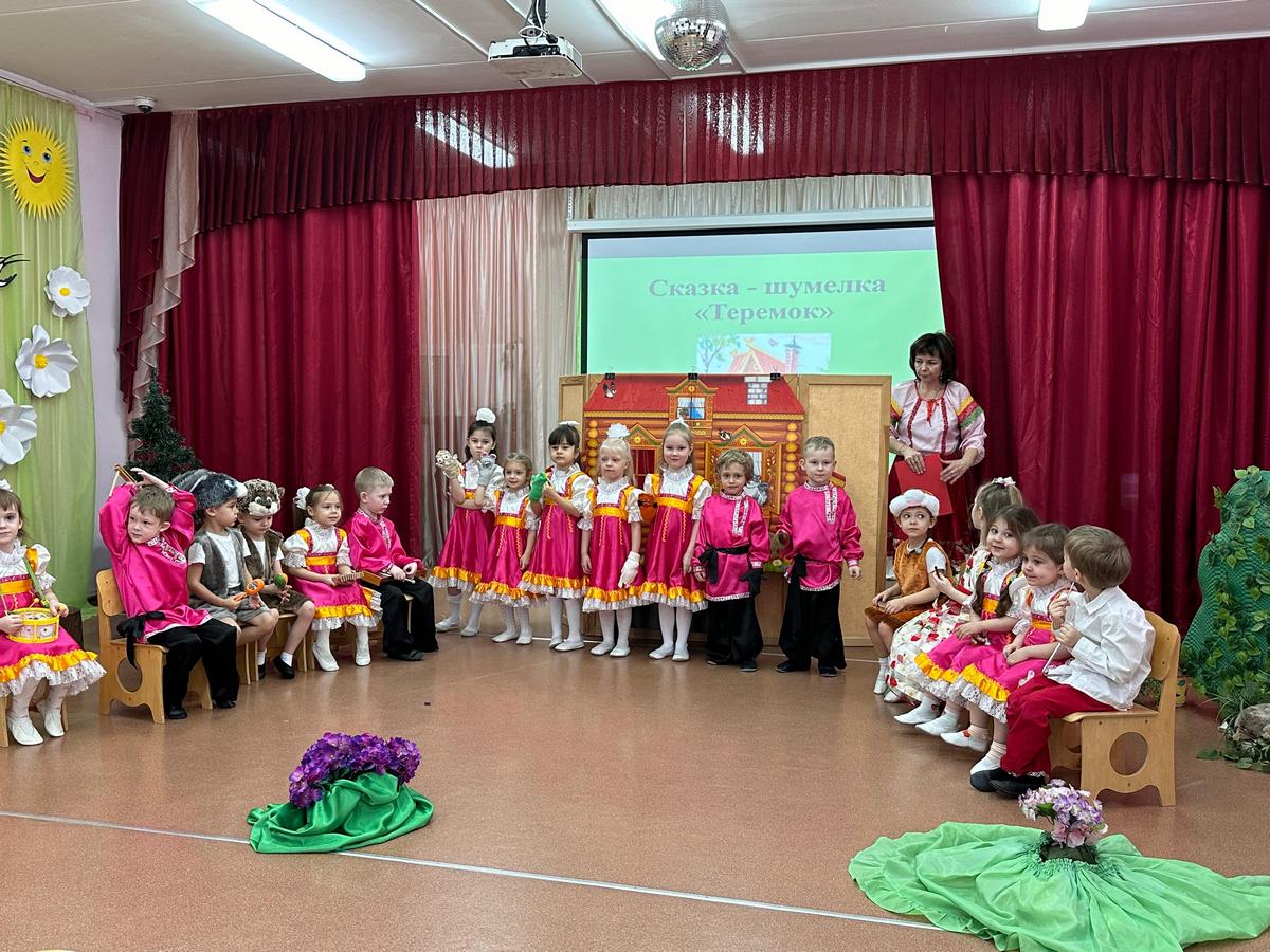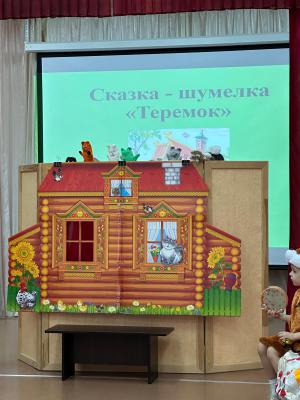 Вниманию родителей были представлены две сказки: «Теремок» – с использованием варежкого театра и шумового оркестра (в ней приняли участие все дети группы) и экологическая – костюмированная «Зая Морковкин и его друзья». Во время перерыва между сказками был проведен с детьми и родителями блиц-опрос «Что мы знаем о театре»; затем все вместе весело потанцевали «Танец маленьких утят».