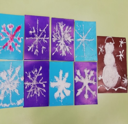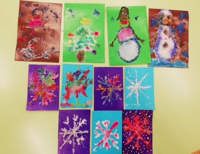 Сначала ребенок рисует изображение простым карандашом, а затем наносит на изображение клей ПВА и посыпает солью. А когда соль высохнет, можно раскрасить акварельными красками.
