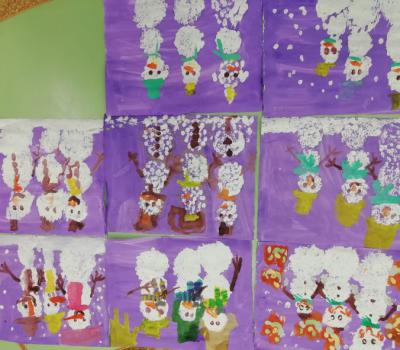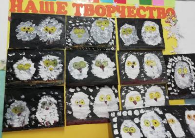 Поролоновые рисунки. Ребенок макает кусочком поролоновой губки в гуашь и наносит орнамент. Можно нарисовать мордочки зайчат, белых сов и даже хищного тигра.